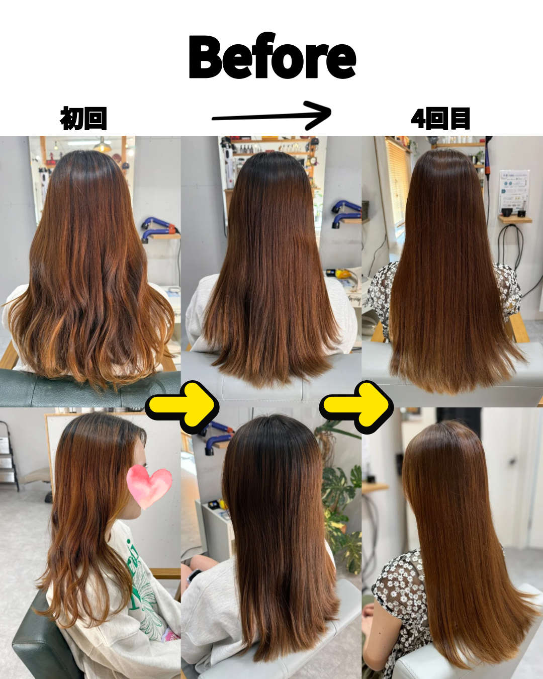 Beforeを綺麗にしていくにはダメージを最小限に施術していく事が大切。後はトリートメントで髪の防御力を上げていく事です。僕の施術履歴からしっかり綺麗な髪になっていきます。
